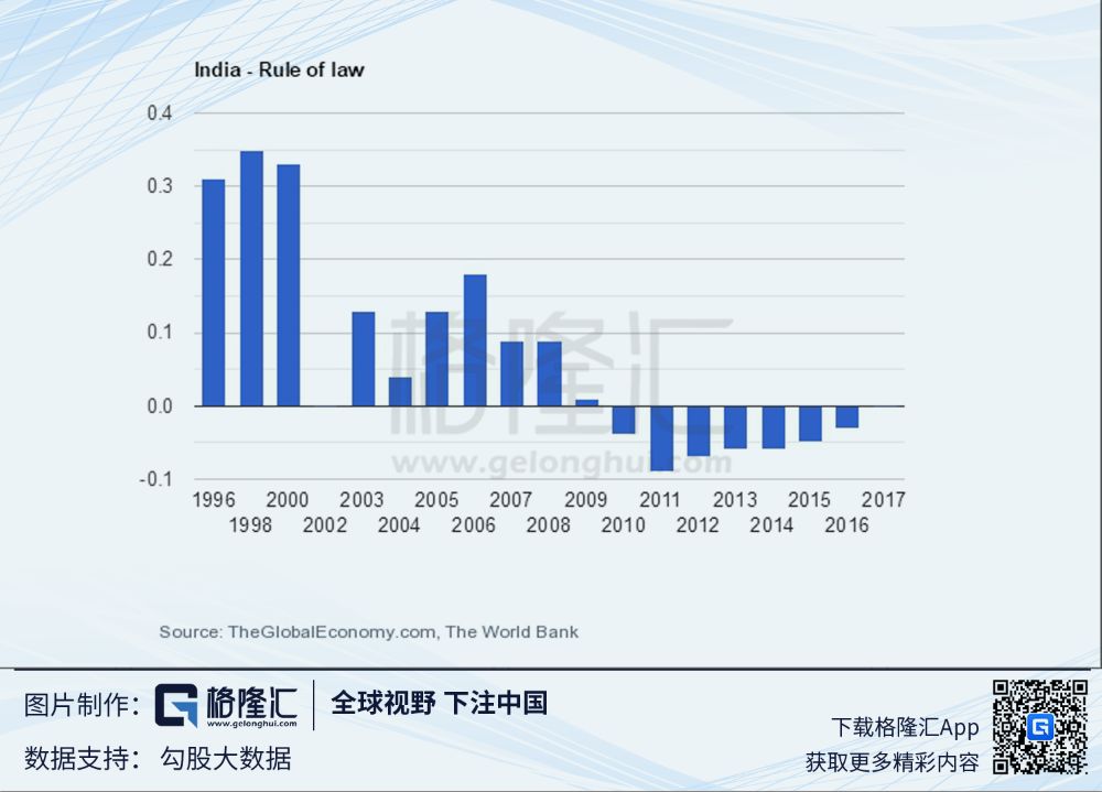 根据世界银行编制的法治指数(Rule of law index 【-2.5 weak; 2.5 strong】反映了民众对合同执行质量、财产权、警察和法院等社会规则的信心和遵守程度,以及犯罪和暴力的可能性),印度的法治水平这些年一路下行,该指数在2009年由正转负。