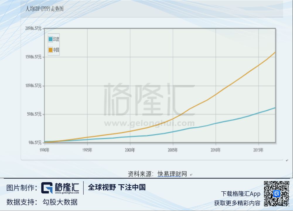 1991年时中印的人均 GDP(PPP平价下)差不多处于同一起点,在1000美元左右。但到2017年的时候差距已经拉开,相差一倍有余。