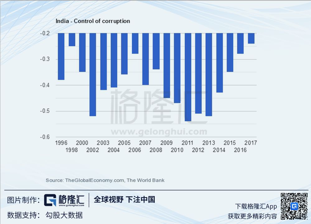 印度政府的腐败也是世界知名。根据世界银行公布The index for Control of Corruption(腐败控制指数【-2.5 weak; 2.5 strong】反映了人们利用公权力为私人利益服务程度的看法)显示,尽管近年来印度政府的腐败程度有所减轻,但2017年仅排名在全球96名的水平。非政府组织“透明国际”发布的2017年度“全球清廉指数”中,印度排名81位,则是另一佐证。