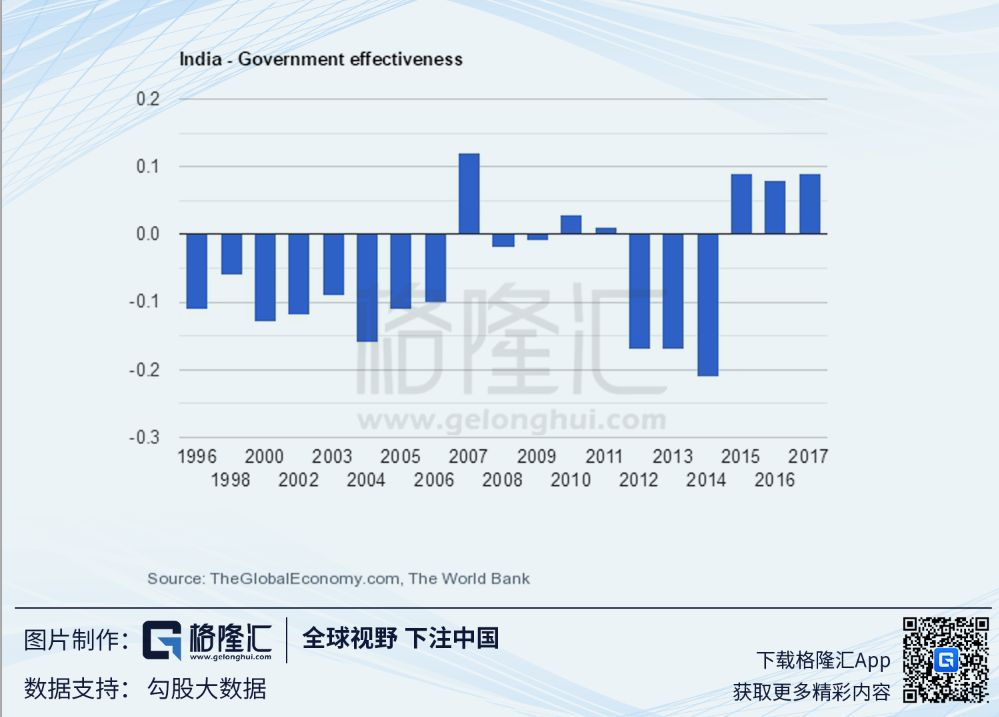 根据世界银行发布的Government effectiveness index(政府效率指数【-2.5 weak; 2.5 strong】反映市民对公共服务质素、公务员队伍质素及其独立于政治压力的程度、政策制订和执行的质素,以及政府对这些政策的承诺的信誉)也证明了这一点,尽管印度政府的效率指数最近3年有所提升,但仍在0.1以内的弱水平。