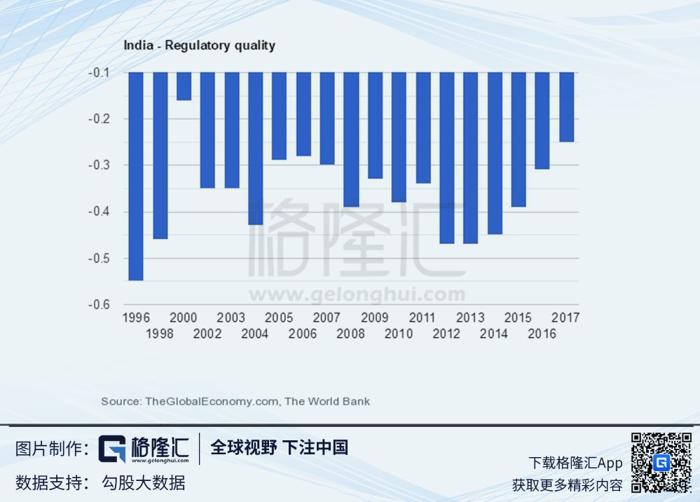 根据世界银行编制 Regulatory quality index( 监管质量指数【2.5 weak; 2.5 strong】)反映了人们对政府有能力制定和执行允许和促进私营部门发展的健全政策和条例的看法)显示,印度在推动私营部门的发展上非常落后(2017年中国香港第一),就是说印度政府缺乏能力制定有效的政策,来推动非政府非国有部门的经济活动。