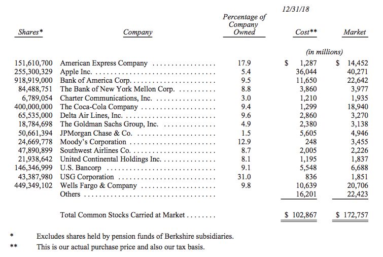 巴菲特的持仓情况备受投资者的关注,2018年底股票组合的市值已经接近1728亿美元。据致股东信披露,在伯克希尔的持仓中,截止2018年12月31日,苹果以402亿美元市值位居第一,美国银行、富国银行、可口可乐、美国运通分列第二到第五位。