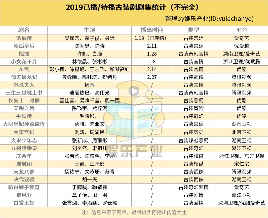 再加上去年多部大IP古装剧的失利,诸如《天盛长歌》《斗破苍穹》《武动乾坤》《凤囚凰》等,更是让市场受到重挫。《延禧攻略》《香蜜》唯二爆款的余热还未散尽,2019年新播古装剧遭遇的凉意已扑面而来。