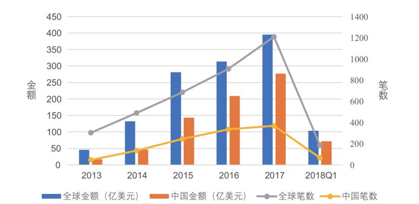 图3.全球投融资金额/笔数(全球人工智能白皮书,2019)