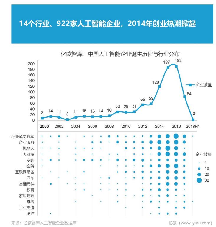 图19.中国人工智能企业成立时间及行业分布(亿欧智库,2019)