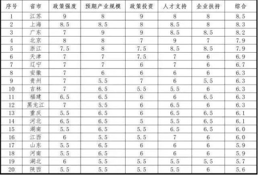 综合以上分析,从政策强度、预期产业规模、政策投资、人才支持、企业扶持五个能够量化的维度,来综合分析未来人工智能发展与投资的热点区域。