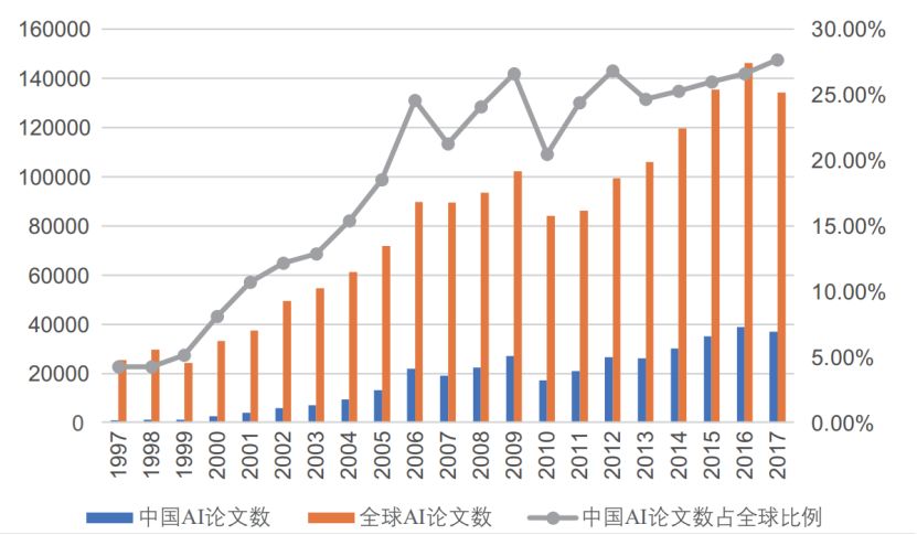 基础学科方面,中国近二十年来在人工智能论文方面获得高速增长:发表论文数由1997年的1000余篇上升到2017年的37000多篇,在人工智能领域的论文数量占比也不断上升。