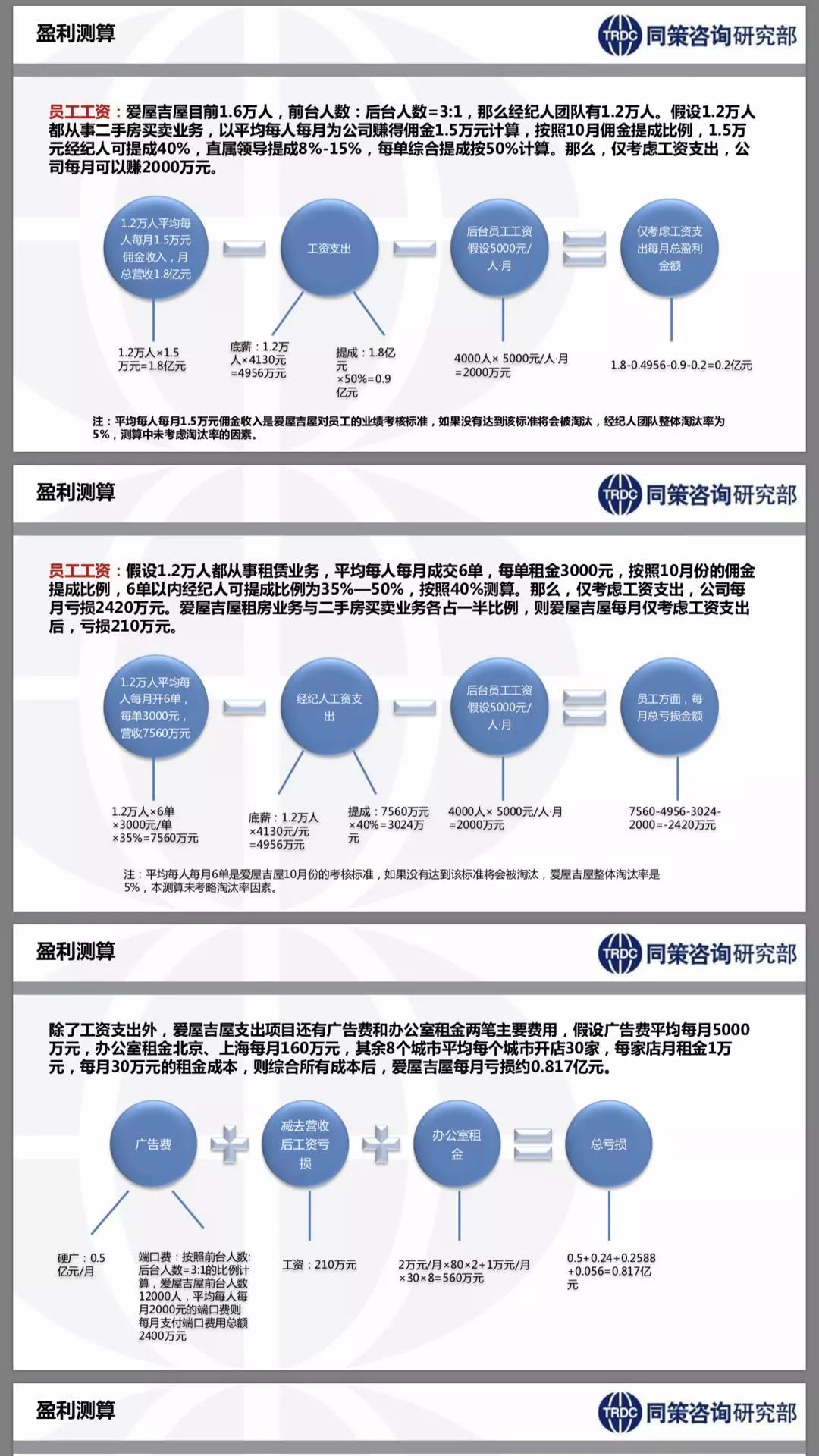 《同策报告》提出,按照爱屋吉屋此前只有1.2万的经纪人的时期计算,租房及二手房业务各占一半,爱屋吉屋每月完成工资支出之后,单月亏损210万元,加上平均每月5000万元广告费、流量端口费,以及560万元的办公室租金,每月总计亏损约8170万元。