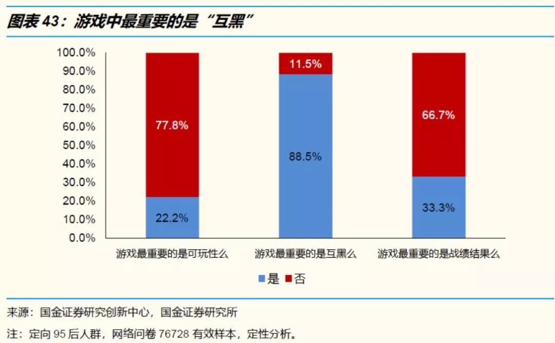 而在《第五人格》这类不平衡性较为明显的游戏,因其是一个监管者对战多个求生者(1v4),求生者需要配合逃脱,“开黑”对于靠谱的队友的选择很重要。根据我们针对95后的调研数据,被访者中有88.5%的人认为游戏最重要的是“互黑”,而仅有22.2%和33.3%的人认为“可玩性”和“战绩结果”是最重要的。