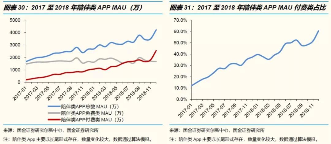 既然有虚拟陪伴需求,当然就会有商家去满足这个需求。我们对移动App市场的监测数据显示:自2017年以来,陪伴类App的MAU增长趋势明显,其中付费类的MAU占比一直在显著上升。2018年12月,陪伴类App的MAU总数达4213万,其中免费类的MAU为1667万,付费类的MAU为2546万。