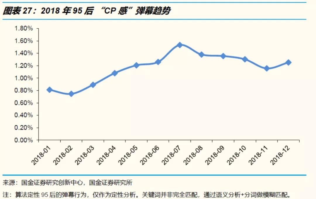 根据我们的自有算法统计,2018年,95后观众发送的视频弹幕之中,“CP感”一词的出现频率高达1-2%,堪称热门关键词。CP的原始涵义仅指恋爱关系,但是近年来涵盖范围不断扩大,包括了基友、搭档甚至敌人等关系。