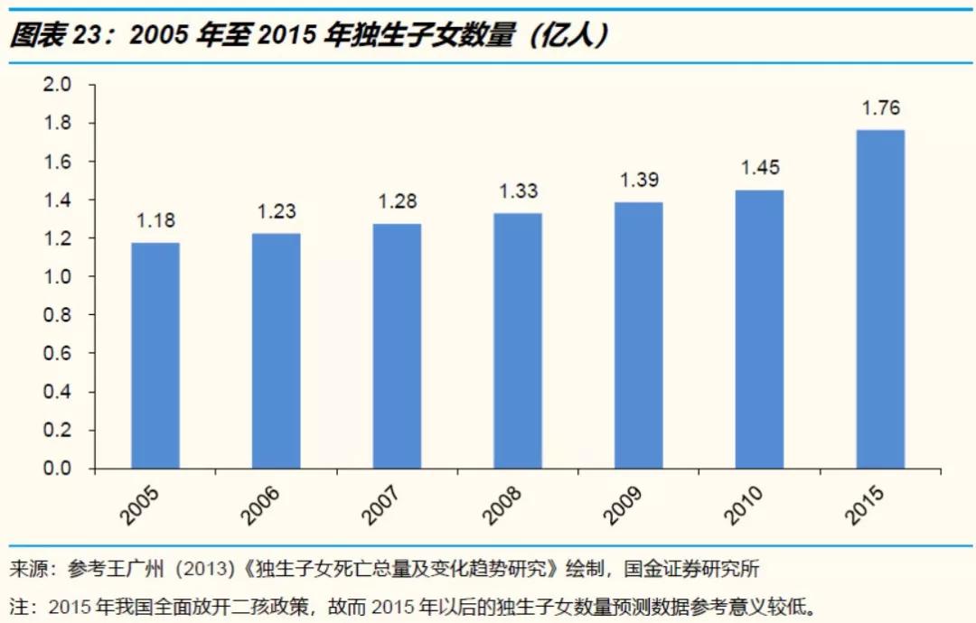 自1982年计划生育至2015年全面放开二孩期间,大多数95-10后落入独生子女行列,同龄亲属陪伴关系缺失。我们参考中国社会科学院人口与劳动经济研究所2013年的论文《独生子女死亡总量及变化趋势研究》中随机微观人口仿真方法测算的数据,得出我国2010年和2015年独生子女数量分别为1.45亿人和1.76亿人。
