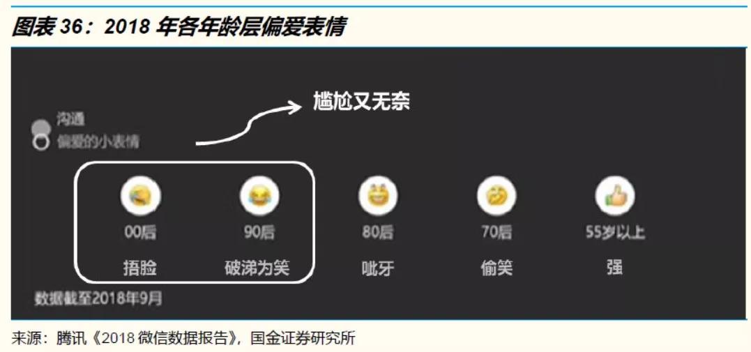 95后独特语言体系的形成,进一步加深了沟通的壁垒。除了独特的通讯工具,95后群体的封闭感意识还通过独特的语言体系实现——特有风格表情包和语言缩写体系。根据腾讯发布的《2018微信数据报告》,00后和90后偏爱“捂脸”和“破涕为笑”两个表情,在微信应用场景下,往往表达一种“尴尬无奈又不失礼貌”的态度,这也是他们与上一个年龄段人群社交时的常态。