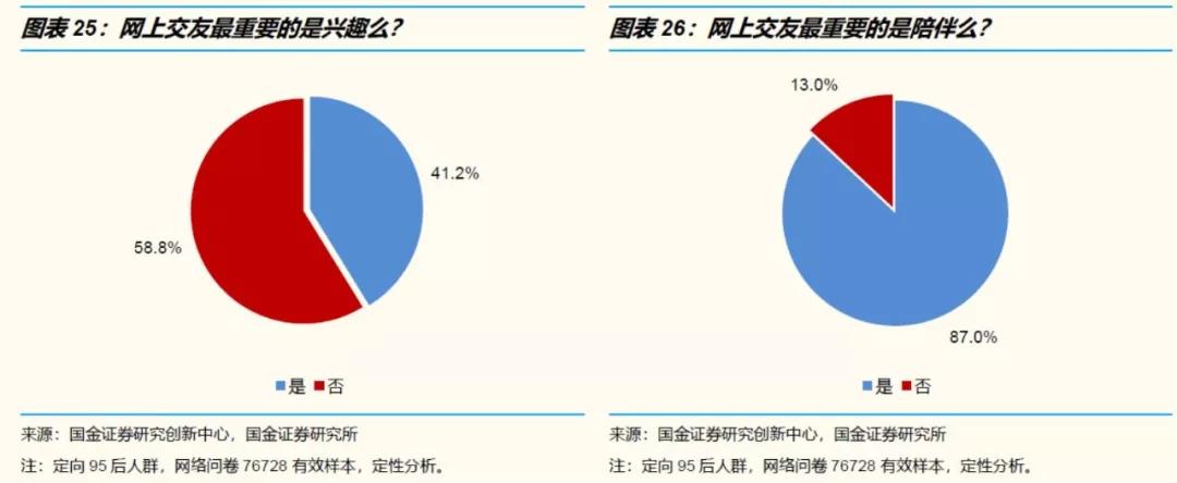 我们认为,“陪伴”是网上交友的出发点,绝大部分95后的网上社交都是为了缓解孤独感;而“兴趣”只是网上交友的“标签匹配因素”,它的重要性只有在互相磨合的过程中才会体现出来。如果没有陪伴,虚拟社交根本不会开始。