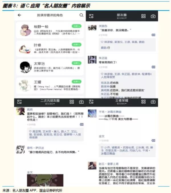 以“名人朋友圈”为例,任何用户都可以从数以千计的历史名人、娱乐明星、各行各业精英当中选择一个扮演,发表符合其身份的图文信息,并且回复其他“名人”发表的信息。