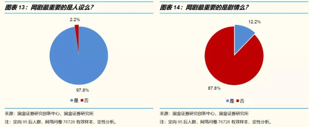 根据我们针对95后人群的问卷调查,被访者中有97.8%的人认为网剧最重要的是人设,同时仅有12.2%的人认为网剧最重要的是剧情。在热门网剧上映时,百度贴吧、豆瓣小组、QQ兴趣部落里讨论最多的,往往是“主角的人设是否讨喜”。