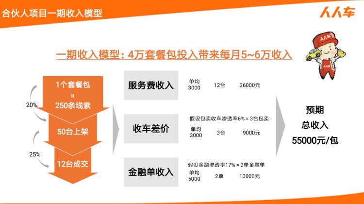 在人人车公布的“人人车城市合伙人计划书”中显示,一份售价4万的套餐包中包含了250条卖家线索,按照以往交易25%的转化率计算,成交12台车辆,服务费平均为3000元,12台车辆将带来36000元服务费收入。