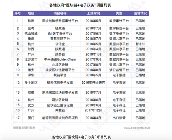 再者,地方政府也将区块链与电子政务紧密联系在一起。2018 年 8 月 10 日,深圳市税务局首当其冲,落地区块链电子发票项目,深圳也成为全国区块链电子发票首个试点城市。其他各级政府“电子政府+区块链”的情况,如下所示: