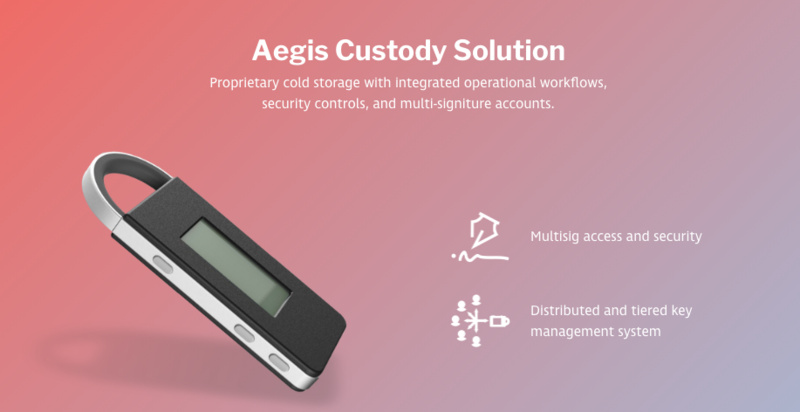 根据官网信息显示,Aegis Custody 是一款数字资产管理解决方案,专为因安全问题而不愿进入数字资产市场的机构设计。主要产品为链式多重签名硬件钱包,并通过云服务提供加密备份的方式来保护私钥。目前支持 BTC、ETH。此外,安全组合将分成单独的功能,由分布在全球各地的运营团队管理。