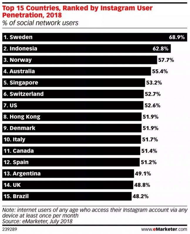eMarketer的数据显示,Instagram在各国/地区的渗透率排名前十依次为:瑞典、印尼、挪威、澳大利亚、新加坡、瑞士、美国、中国香港、丹麦和意大利。