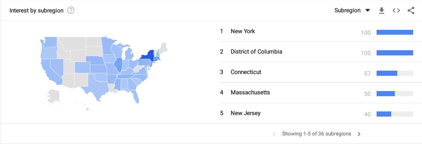 “亚马逊外套”在全美的搜索热度,纽约州高居第一 | 来源:谷歌趋势