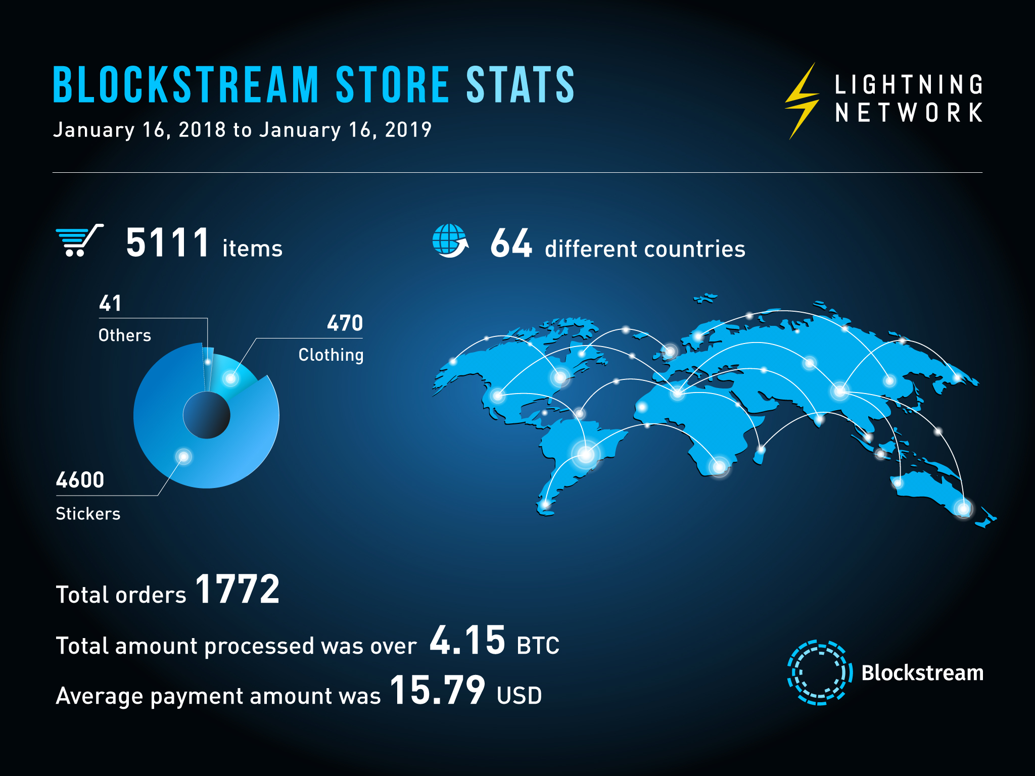 缪永权:我们有一个节点,用来支持 Blockstream 商店。我个人还有一个节点,用来支持 Excellion 帽子商店。关于闪电网络的数据,你可以在这个网站上查询:https://1ml.com/。如果想知道我们商店的数据的话,下面是一个信息图: