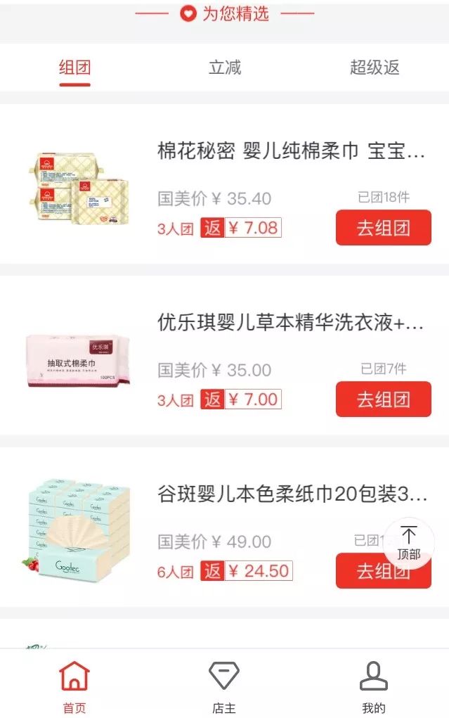 “组团”是最能体现社交电商属性的一种方式,国美美店App在售产品主要是纸巾、儿童保湿霜和口红,消费者按商品原价预支付、邀请好友成团、组团成功即可获得返利。