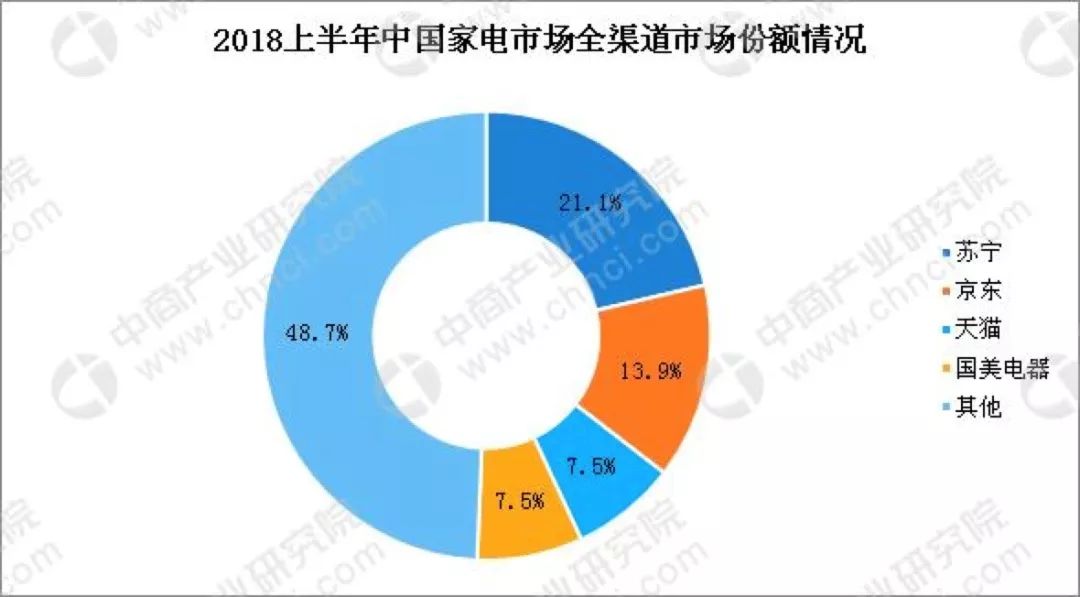 结果是,两者的市场地位今非昔比。《2018年中国家电行业半年度报告》显示,2018年上半年,苏宁以21.1%的全渠道家电销售份额居市场第一,国美仅居第三,占7.5%。