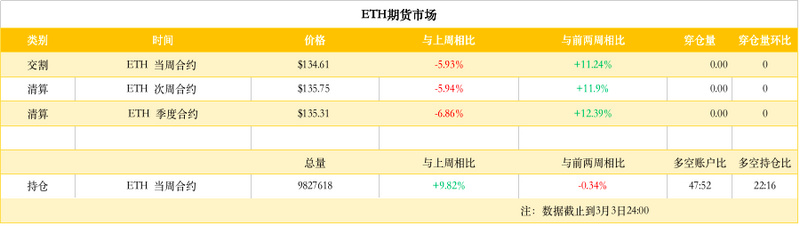 OKEx数据显示,期货交割层面,ETH 当周合约交割价格为 134.61 美元,与上周相比环比下跌 5.93 % ,季度合约与次周合约均下跌超过 5 % ;不过,所有合约相较于两周前,仍然上涨超过 10 %。