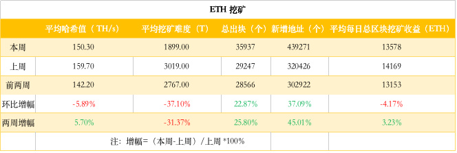 出块时间的缩短,带来出块数量的增加,本周总出块环比上涨 22.87 % ;不过,由于每个块的挖矿收益由 3 个降为 2 个,所以“平均每日总区块挖矿收益”反而下降了4%。