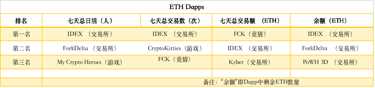 此外,七天总交易额中,竞猜游戏 FCK 继续抢占榜首,总交易额达到 36700 个ETH,是第三名的 ForkDelta 交易额的三倍。