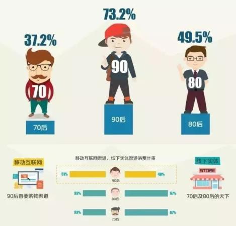 有报告曾随机抽取中国银联及京东网络40万活跃样本用户,通过双方数据交叉分析,展示了国内2015年—2017年的消费升级发展趋势。根据报告数据显示,90后消费金额增长迅猛,同比增长73%,远高于70、80后,增幅达70后的近两倍。在消费渠道方面,90后移动互联网消费转化趋势显著,移动互联网渠道花销超过了日常消费支出的一半。70、80后线下渠道购物仍是核心,近七成消费金额通过线下实现。在手机消费方面,国产品牌市场份额快速提升,已占市场近六成规模,迅速从中低端产品向中高端升级。而90后则是最愿意为手机买单,客单价最高的群体。