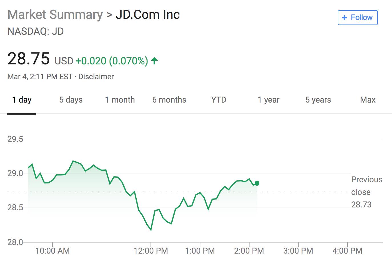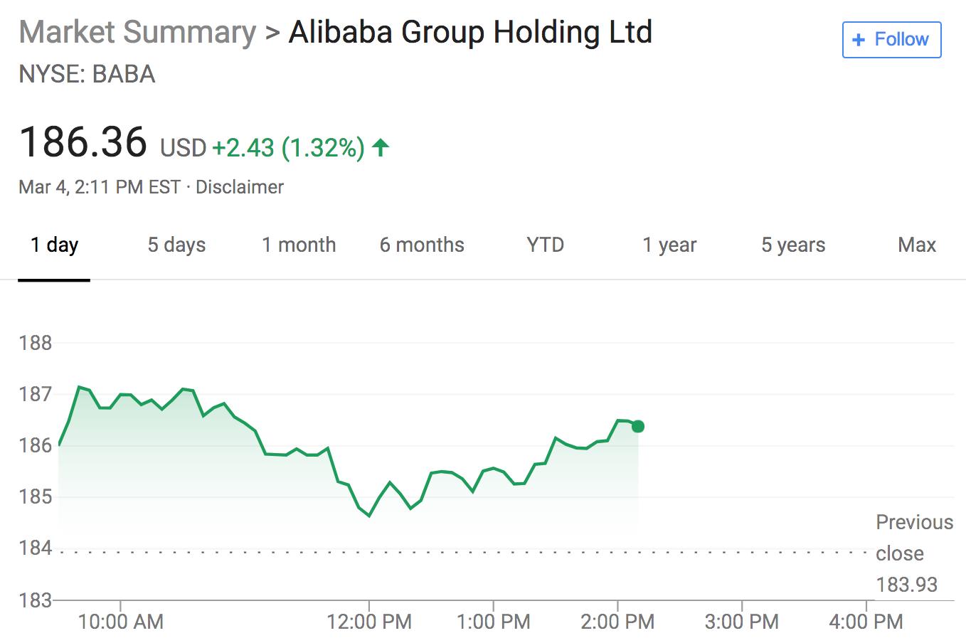 周一,截止美东时间下午两点11分,阿里巴巴股价上涨1.32%,京东股价微涨0.007%。