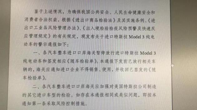 据每日经济新闻报道,3月4日,特斯拉Model3疑似被暂停放行,一份疑似从海关流出的文件显示:“各汽车整车进口口岸海关暂停放行进口特斯拉Model 3纯电动车和签发相应《随车检验单》,通报下发前已放行相关车辆的,海关应通知进口企业不得销售、使用,并收回已签发的《随车检验单》。同时,各汽车整车进口口岸海关要加强对美国特斯拉公司制造的其它进口车型的检验”。