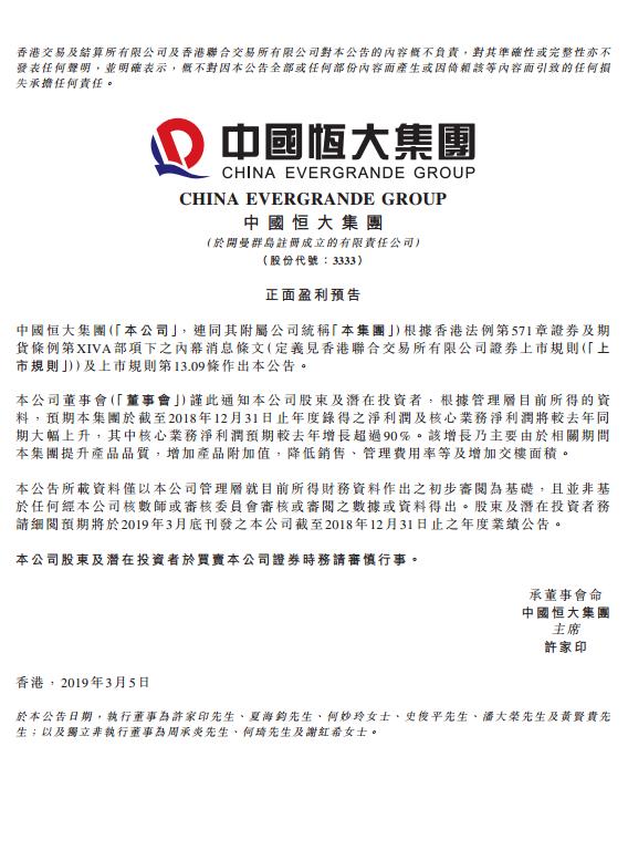 3月5日,中国恒大(03333.HK)发布正面盈利预告,称其2018年净利润和核心业务净利润均实现大幅增长,其中核心业务净利润同比大增90%以上。