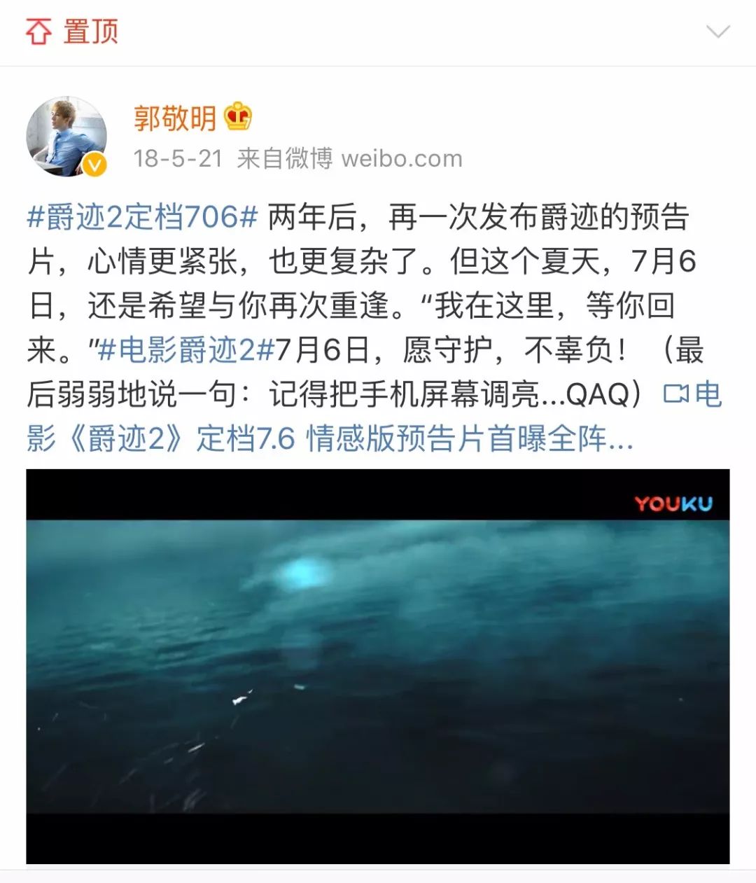 郭敬明的置顶微博,依然是《爵迹2》的预告片。“我在这里,等你回来。”这句文案背后所蕴含的期许与寄望,也只有郭敬明本人最能感同身受了。
