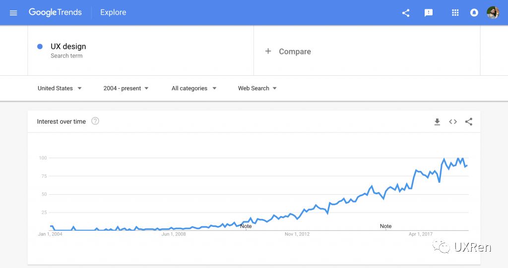 用户体验相关的词汇在2009年初开始成为行业术语。截图来自Google Trends