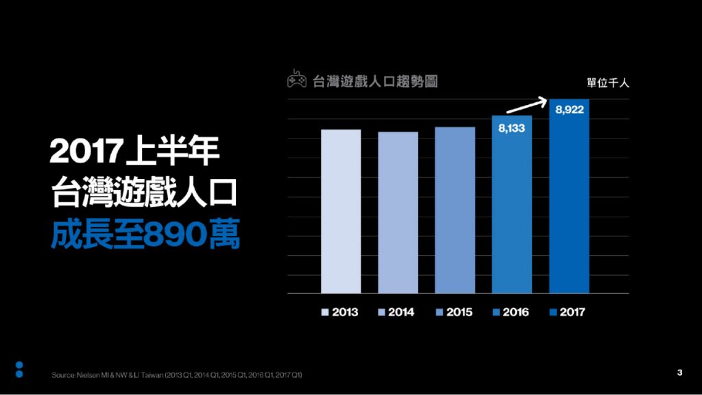 在游戏海外发行的浪潮中,中国台湾市场成为众多厂商的出海选择。2017年《Yahoo奇摩电玩大调查》显示,2016年亚太游戏市场收入已经占据全球游戏市场的半壁江山,其中台湾地区游戏收入在亚太市场名列第五;2017年上半年,中国台湾市场游戏玩家已经达到890万。