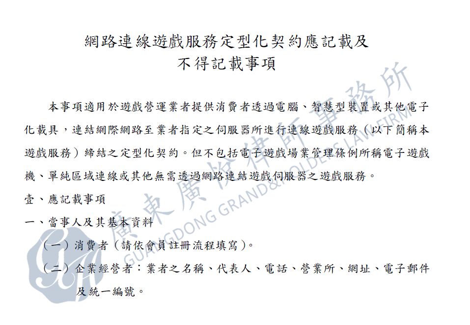 为了保障网络游戏玩家的权益,台湾地区制定了关于消费者和游戏企业之间的“线上游戏定型化契约”(即“网络游戏格式合同”)范本以及《网路连线游戏服务定型化契约应记载及不得记载事项》(下称“关于格式合同的文件”),明确规定企业经营者所制定的游戏管理规则与关于格式合同的文件相抵触者无效,对处理注册、盗用游戏帐号等事宜进行了规范。