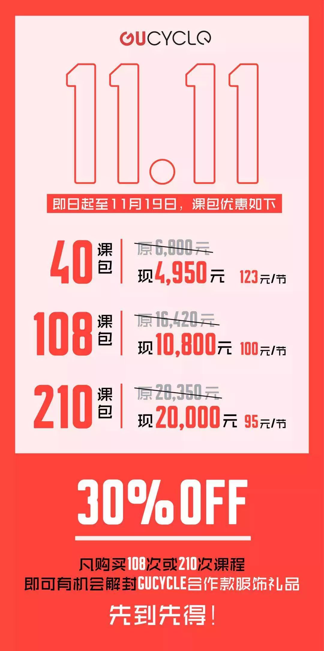 从GuCycle的官方公众号上依然可以看到,GuCycle主力推的卡包,10次课包1850,30次课程4950。但在双十一的主力推广课包,分别是40节/4950元、108节/10800元,以及210节/20000元。
