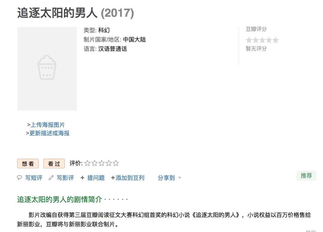 例如,由豆瓣发起的飞船影业和暴风集团推出的暴风影业均在2016年成立。飞船影业在成立之时也一同公布了公司的第一个项目“青年导演短片计划”,按照当时的计划,飞船影业希望一年内有 3-4 个主导的项目孵化完成,截至目前,通过猫眼专业版可以查询到的飞船影业的作品列表中只有一部《追逐太阳的男人》,豆瓣页面显示这部影片为科幻题材,由豆瓣和新丽联合制作,原计划2017年上映,不过现在也无更新动向了;