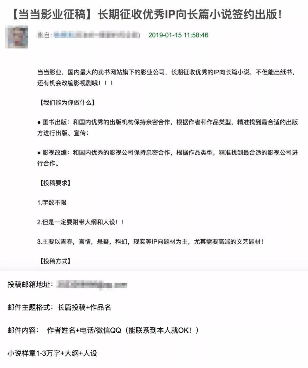 不过今年年初豆瓣页面上查询到的一副帖子上显示“当当影业征稿”,征稿启事中表示“当当影业长期征收优秀的IP向长篇小说,不但能出纸书,还有机会改编影视剧哦!!!”尚不知这则启事真假。