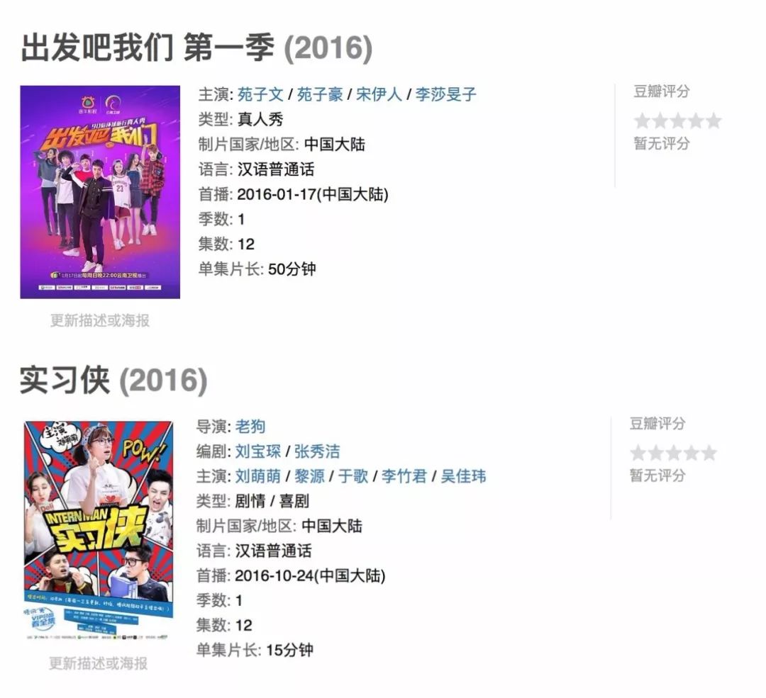 统计表格中还有两家公司,将影业重心放在综艺和剧集制作上,如2015年成立的途牛影视,曾在2016年和云南卫视共同推出的一档90后环球旅游真人秀节目《出发吧我们》,并在云南卫视播出,不过这档节目目前在豆瓣页面尚未有评分;同样还有2016年成立的一下影业,陆续推出台湾综艺型网剧《我们这群人》、网剧《实习侠》等,如今这两家公司似乎也偃旗息鼓了。