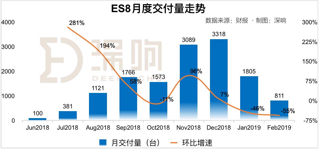 蔚来第四季度交付整车7980辆,相比较第三季度的4206辆,增加92%;但是根据公司披露的19年第一季度业绩预期,蔚来在一季度预计交付ES8 3500-3800辆,相比较第四季度大幅下降。