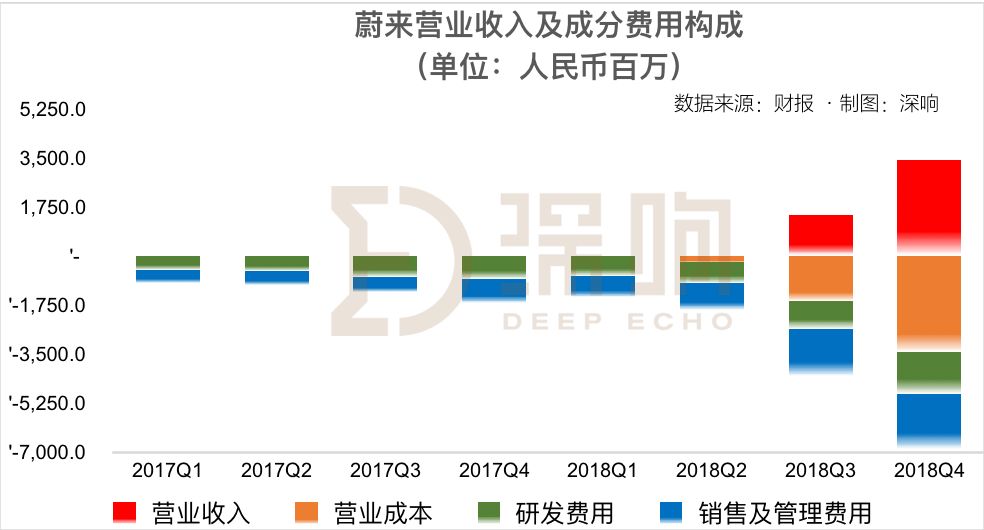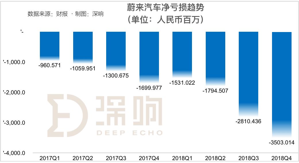 蔚来2018全实现全年营收49.5亿元,净亏损96.4亿元,净亏损额同比扩大92%。第四季度净亏损为35亿元,相比较上季度的亏损28.1亿,环比扩大25%。
