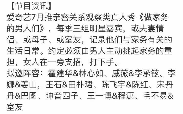 另外,网 传爱奇艺还将制作一档亲密关系观察类新节目——《做家务的男人》们。传说中夫妻,母子或室友的设定有点像江苏卫视去年的一档“糊综”《三个院子》。在网娱君看来,选人几乎是一锤定音的决定因素。