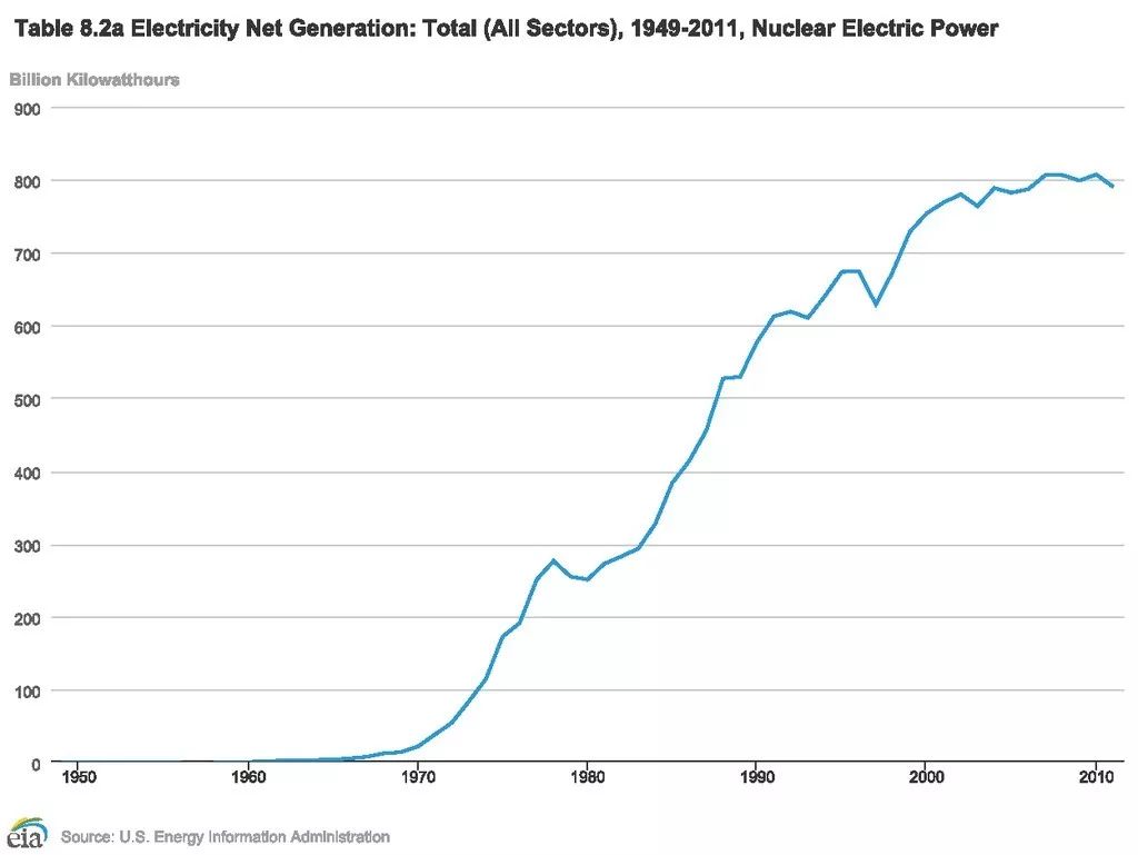 自2000年以来,核能发电一直保持的相当稳定,尽管增长几乎停止了