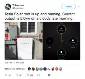 在特斯拉2018年第二季度财报电话会议上,马斯克表示公司已拥有”数百套带有太阳能屋顶的房屋”,公司后来澄清他所说的数量包括计划安装及部分安装的屋顶。据路透社报道,在2018年5月,安装并连接到电网的屋顶只有12个。