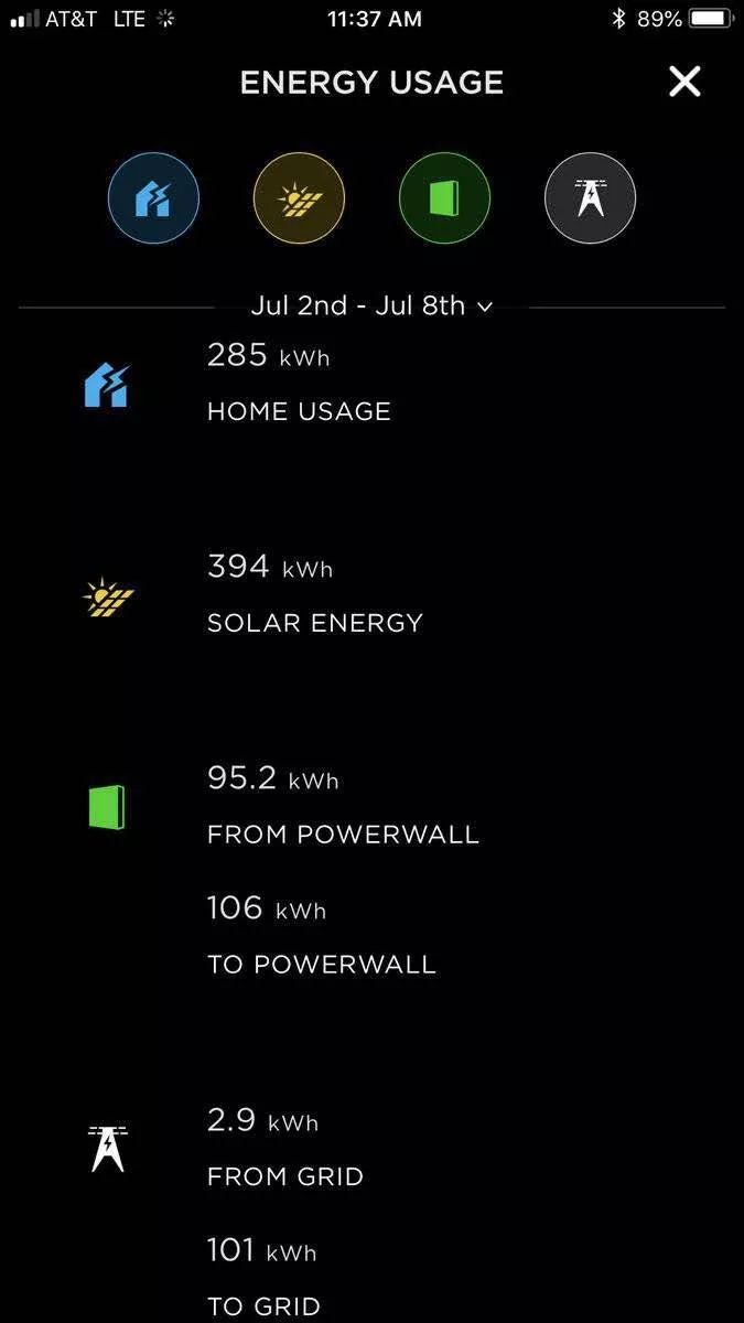 仅仅一周时间,太阳能屋顶就产生了394kWh的电,远高于美国居民平均用电量~225kWh/周。