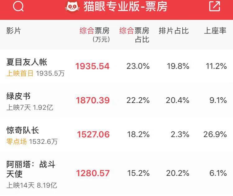 猫眼数据显示,《夏目友人帐》上映3天,累计票房6458万,排片占比从首日19.8%下滑至11.9%,对比此前《龙猫》国内复映时的排片情况,《惊奇队长》对其产生的挤压效果不小。但值得注意的是,《夏目友人帐》首日票房近2000万,取得2019年日本进口动画电影的最高成绩,《惊奇队长》上映后票房受到冲击,但周末单日票房实现逆跌,猫眼预测其总票房将达1.31亿。